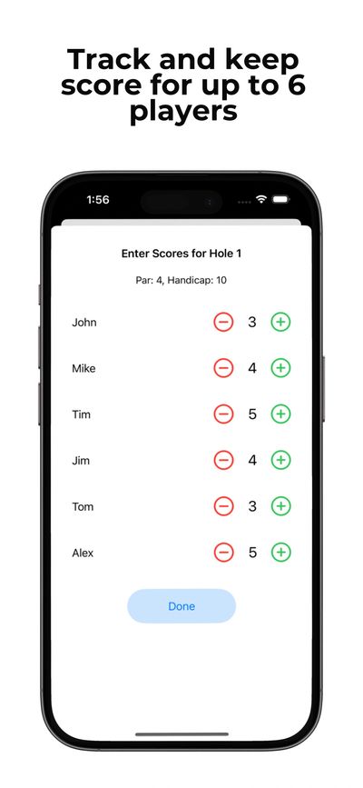 Easily input scores for up to 6 players across 18 holes. View individual gross and net scores in real-time.